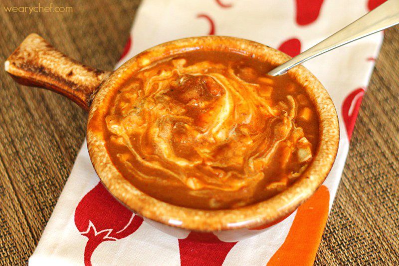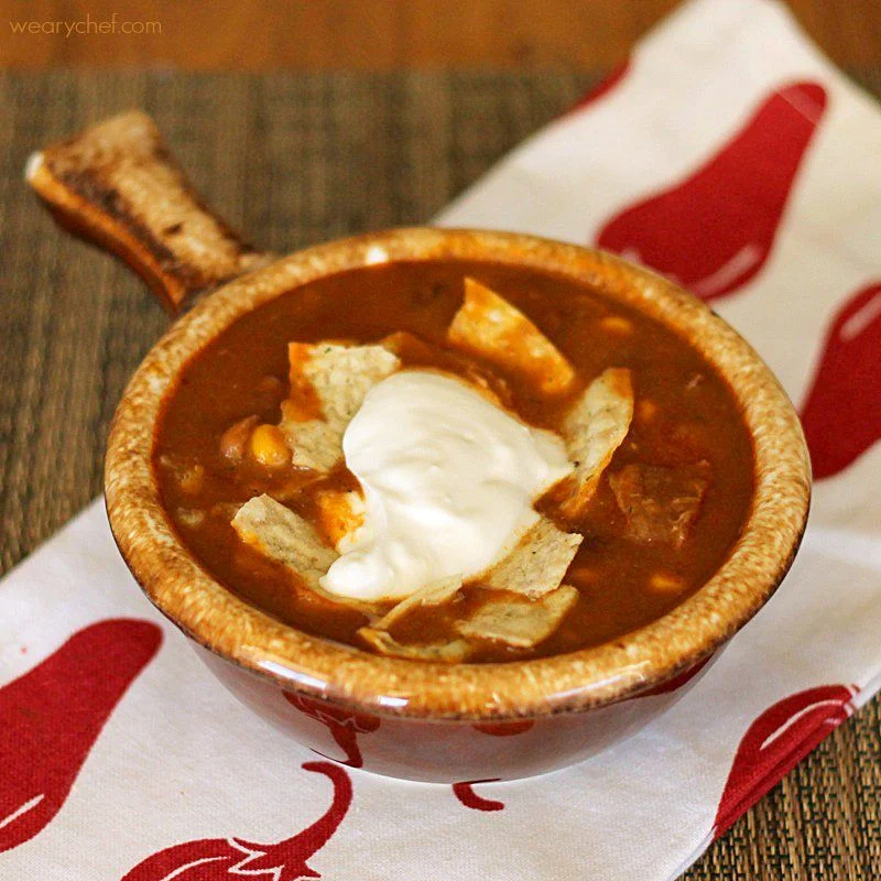 I recently had a cup of chicken enchilada soup at Chili’s and loved it. We don’t eat there often, but it has become the favorite dinner after the boys get their haircuts since its nearby. Nothing makes you hungry for a kid’s meal at a chain restaurant like getting your hair cut I suppose. Anyway, I wouldn’t exactly call this a Chili’s copycat recipe, especially since theirs is made with chicken, but it was definitely inspired by that soup.