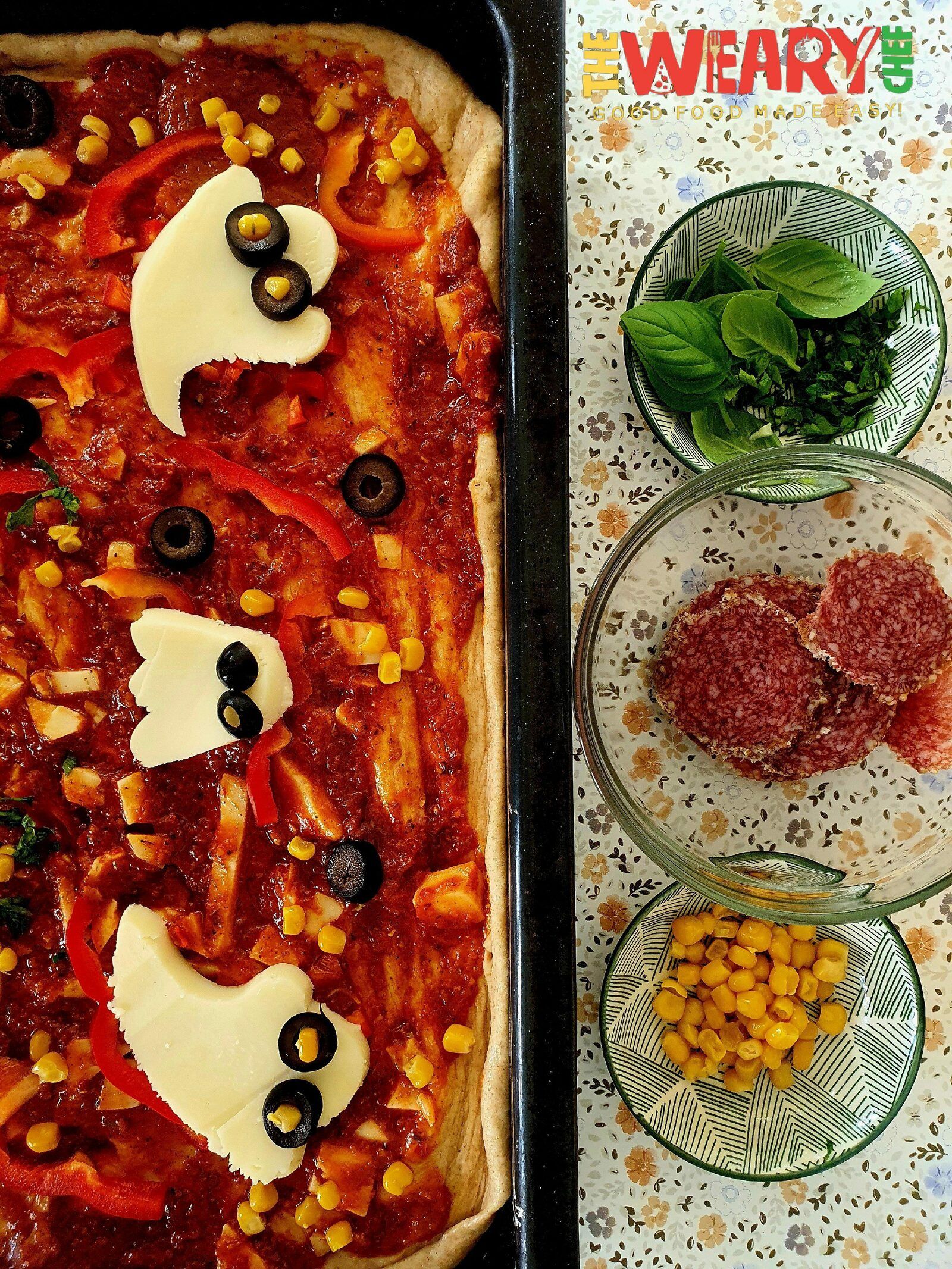 Make this cheesy haunted Halloween pizza with simple ingredients and an easy step-by-step recipe with images. The perfect dinner idea to impress your Halloween guests, not to mention the pizza is ready in less than 30 minutes.
