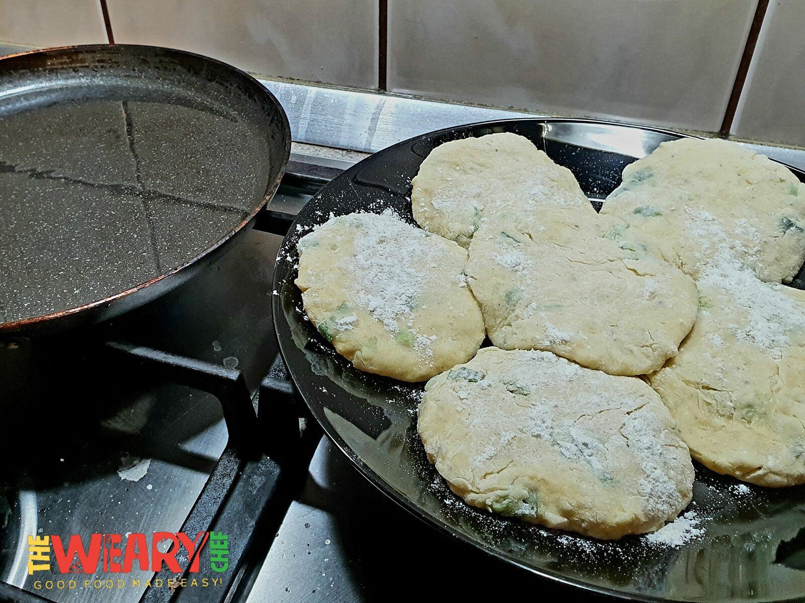 Place the remaining flour in a shallow dish and carefully dredge each pancake in the flour before frying.